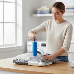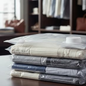 Possui sistema a vácuo que permite triplicar o espaço de armazenamento, além de ser reutilizável, impermeável e prático, protegendo suas peças da umidade, poeira, mofo, sujeira e insetos.