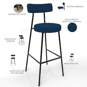 Amplamente moderna, dispondo de muito realce e design singular, a Banqueta Alta Bar Cozinha Sala De Jantar Estrutura Em Aço Milão L02 Suede Azul Marinho - Lyam Decor vem com a personalidade e elegância que sua decoração merece! Estruturada em aço carbono, contrasta lindamente com o encosto e assento estofados, cabe mencionar ainda seu revestimento em Linho, é confeccionada por materiais de excelente qualidade, extremamente resistentes e aconchegantes.