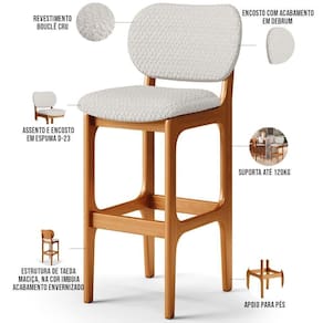 Amplamente sofisticada, o Kit 6 Banquetas Alta Para Cozinha Fixa Betta L02 Imbuia Bouclê Cru - Lyam Decor irá agregar ainda mais valor em sua decoração!! Sendo capaz de compor muito bem o ambiente, é produzida com materiais de excelente qualidade, a resistente estrutura em madeira de Taeda, na cor imbuia, conta com apoio para os pés (que garante maior segurança), além do assento e encosto estofados super confortáveis e convidativos, que são revestidos em tecido Bouclê, extremamente elegante.