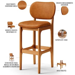 Amplamente sofisticada, o Kit 6 Banquetas Alta Para Cozinha Fixa Betta L02 Imbuia Couríssimo Canela - Lyam Decor irá agregar ainda mais valor em sua decoração!! Sendo capaz de compor muito bem o ambiente, é produzida com materiais de excelente qualidade, a resistente estrutura em madeira de Taeda, na cor imbuia, conta com apoio para os pés (que garante maior segurança), além do assento e encosto estofados super confortáveis e convidativos, que são revestidos em tecido Couríssimo, extremamente elegante.