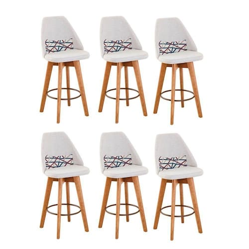 Kit 06 Banquetas Alta Maya Giratória Com Encosto Linho Bege Claro E Almofada Linhas Coloridas - Aurora Line Banqueta Maya Giratória - Aurora Line A Banqueta Maya possui assento e pés em madeira eucalipto com sistema giratório! Os pés contam com um reforço que proporciona um suporte de peso de até 120 Kgs.O assento é revestido com espuma D-23. Além de bonita e charmosa, vai trazer para seu ambiente elegância e proporcionará conforto para sua família e amigos nos momentos de lazer.