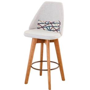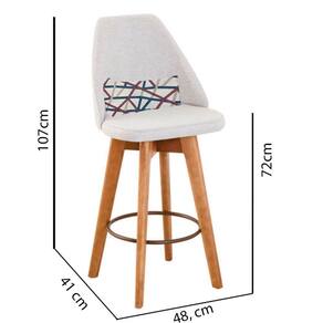 - Altura Total: 107cm; - Largura Total: 48,5cm; - Profundidade Total: 41cm; - Altura do chão até o assento: 72cm. - Assento revestido com espuma D-23; - Base Giratória em madeira de Eucalipto; - Arco redondo em ferro; - Assento em tecido; - Suporta até 120kg.