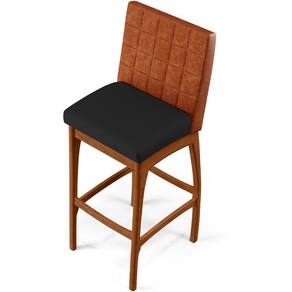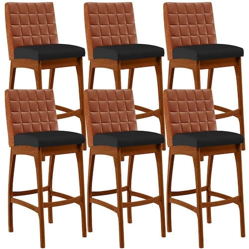 ndo muita excelência, o Kit 06 Banquetas Altas Cozinha Sala Jantar Fixa Mila B04 Couríssimo Camel Corano Preto - Lyam Decor é o complemento que faltava para deixar sua casa ainda mais extraordinária. Seu encosto com costura em padrão quadriculado e assento estofados, centralizam em si uma graciosidade estonteante, sem perder todo o conforto. A estrutura em madeira, na cor nozes, também é digna de notoriedade, por imprimir bastante personalidade a sua decoração. Vale ressaltar ainda, o apoio para os pés que garante maior à banqueta.