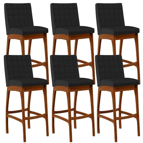Entregando muita excelência, o Kit 06 Banquetas Altas Para Cozinha Sala De Jantar Fixa Mila B04 Facto Preto Fosco - Lyam Decor é o complemento que faltava para deixar sua casa ainda mais extraordinária. Seu encosto com costura em padrão quadriculado e assento estofados, centralizam em si uma graciosidade estonteante, sem perder todo o seu conforto. A estrutura em madeira, na cor nozes, também é digna de notoriedade, por imprimir bastante personalidade a sua decoração. Vale ressaltar ainda, o apoio para os pés que garante maior segurança à mesma.