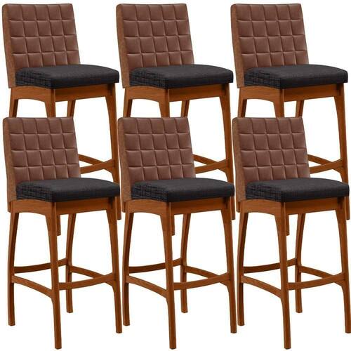 ndo muita excelência, o Kit 06 Banquetas Altas Cozinha Sala Jantar Fixa Mila B04 Couríssimo Marrom Linho Chumbo - Lyam Decor é o complemento que faltava para deixar sua casa ainda mais extraordinária. Seu encosto com costura em padrão quadriculado e assento estofados, centralizam em si uma graciosidade estonteante, sem perder todo o conforto. A estrutura em madeira, na cor nozes, também é digna de notoriedade, por imprimir bastante personalidade a sua decoração. Vale ressaltar ainda, o apoio para os pés que garante maior à banqueta.