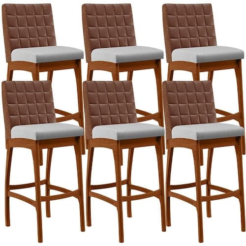 ndo muita excelência, o Kit 06 Banquetas Altas Cozinha Sala Jantar Fixa Mila B04 Couríssimo Marrom Linho Cinza - Lyam Decor é o complemento que faltava para deixar sua casa ainda mais extraordinária. Seu encosto com costura em padrão quadriculado e assento estofados, centralizam em si uma graciosidade estonteante, sem perder todo o conforto. A estrutura em madeira, na cor nozes, também é digna de notoriedade, por imprimir bastante personalidade a sua decoração. Vale ressaltar ainda, o apoio para os pés que garante maior segurança à banqueta.