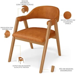Características: Estrutura de Madeira de Eucalipto tratado de reserva legalizada, correto ecologicamente. Revestimento em Couríssimo na cor Canela. Assento e encosto com espuma D-26. Peso máximo suportado por cadeira até 150 kg. Pés em madeira envernizados. Design orgânico, com linhas curvas. Produto entregue montado.