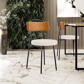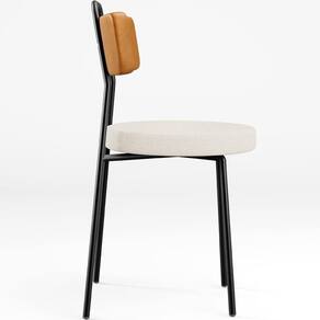 Revestimento do encosto em Couríssimo na cor Whisky e do assento em Linho na cor Cru, com acabamento semi brilho.
