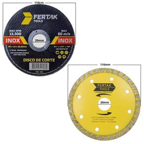ITENS INCLUSOS 01 Disco de Corte para Porcelanato 01 Disco de Corte Para Metal 115x1x22 01 Disco de Desbaste Metal Aço Ferro Inox 115x22mm 01 Disco Diamantado 110x20mm 01 Disco Diamantado 110x20mm 01 Disco Diamantado Turbo 110x20mm 01 Disco De Corte Serra Circular Para Madeira 24 Dentes Marca: Não Informado