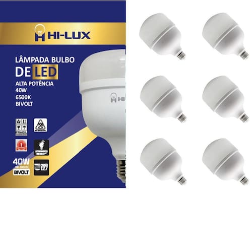Perfeitas para grandes ambientes residenciais e comerciais, as Lâmpadas LED de ALTA POTÊNCIA mantêm o ambiente bem iluminado com uma instalação simples.Produto certificado e de acordo com as diretrizes do INMETRO.PROPRIEDADES- Corpo da lâmpada e difusor em policarbonato.- Não aquece o ambiente (não emite infravermelho).- Possui driver interno isolado.- Não desbota objetos (não emite ultravioleta).- Composição livre de mercúrio.- Baixo consumo de energia em relação as lâmpadas incandescentes e fluorescentes.- Alto fluxo luminoso.CARACTERÍSTICAS DE FUNCIONAMENTO- Temperatura ambiente: -5°C a 40°C.- Tensão de entrada: 100V a 240V.- Disponíveis na temperatura de cor BR6500KESPECIFICAÇÕES- Índice de proteção: IP20- Tensão: Bivolt Automático 100V - 240V- Ângulo de abertura: 220º- IRC**: >80- Vida útil: 25.000 horas- Potência: 40W- Fluxo luminoso: 3200 lumens- Base: E27- Temperatura de cor: 6500K (Branca)- Eficiência luminosa: 80lm/W-Dimensão (mm): 118mm x 168mmCONTEM: 06 UN LAMPADA DE LED 40W ALTA POTENCIA;