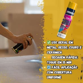Tinta Spray 400ml Amarelo Uso Geral em Aço Ferro Couro Gesso Cerâmica A Tinta Spray 400ml Amarelo Uso Geral é a solução prática para renovar superfícies de metal, gesso, couro e cerâmica. Ideal para dar vida nova a bicicletas, móveis, eletrodomésticos e objetos em geral, garantindo um acabamento moderno e duradouro. Com fórmula de alta qualidade, oferece excelente aderência e acabamento Brilhante, além de resistência superior contra desgastes do dia a dia. Sua cobertura uniforme realça os detalhes e proporciona um resultado em poucas camadas. Prática e fácil de aplicar, a tinta spray seca ao toque em apenas 15 minutos, permitindo agilidade nos trabalhos e economia de tempo. O rendimento de até 2 m por demão garante maior aproveitamento do produto e ótimo custo-benefício. Diferenciais: Acabamento Brilhante com ótima aderência Alta durabilidade e resistência em ambientes internos e externos Secagem rápida e aplicação prática com cobertura uniforme Especificações TÉCNICAS: Volume: 400ml Rendimento: até 2 m por demão Superfícies indicadas: metal, gesso, couro e cerâmica Secagem: toque em 15 minutos Acabamento: Brilhante Recomendação: uso de primer para melhor desempenho Itens INCLUSOS: 06 Tintas Spray 400ml Amarelo Uso Geral