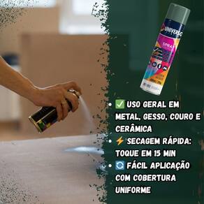 Tinta Spray 400ml Verde Escuro Uso Geral em Aço Ferro Couro Gesso Cerâmica A Tinta Spray 400ml Verde Escuro Uso Geral é a solução prática para renovar superfícies de metal, gesso, couro e cerâmica. Ideal para dar vida nova a bicicletas, móveis, eletrodomésticos e objetos em geral, garantindo um acabamento moderno e duradouro. Com fórmula de alta qualidade, oferece excelente aderência e acabamento Brilhante, além de resistência superior contra desgastes do dia a dia. Sua cobertura uniforme realça os detalhes e proporciona um resultado em poucas camadas. Prática e fácil de aplicar, a tinta spray seca ao toque em apenas 15 minutos, permitindo agilidade nos trabalhos e economia de tempo. O rendimento de até 2 m por demão garante maior aproveitamento do produto e ótimo custo-benefício. Diferenciais: Acabamento Brilhante com ótima aderência Alta durabilidade e resistência em ambientes internos e externos Secagem rápida e aplicação prática com cobertura uniforme Especificações TÉCNICAS: Volume: 400ml Rendimento: até 2 m por demão Superfícies indicadas: metal, gesso, couro e cerâmica Secagem: toque em 15 minutos Acabamento: Brilhante Recomendação: uso de primer para melhor desempenho Itens INCLUSOS: 06 Tintas Spray 400ml Verde Escuro Uso Geral Marca: Não Informado Ean: 7894141438180