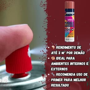 Tinta Spray 400ml Vermelho Uso Geral em Aço Ferro Couro Gesso Cerâmica A Tinta Spray 400ml Vermelho Uso Geral é a solução prática para renovar superfícies de metal, gesso, couro e cerâmica. Ideal para dar vida nova a bicicletas, móveis, eletrodomésticos e objetos em geral, garantindo um acabamento moderno e duradouro. Com fórmula de alta qualidade, oferece excelente aderência e acabamento Brilhante, além de resistência superior contra desgastes do dia a dia. Sua cobertura uniforme realça os detalhes e proporciona um resultado em poucas camadas. Prática e fácil de aplicar, a tinta spray seca ao toque em apenas 15 minutos, permitindo agilidade nos trabalhos e economia de tempo. O rendimento de até 2 m por demão garante maior aproveitamento do produto e ótimo custo-benefício. Diferenciais: Acabamento Brilhante com ótima aderência Alta durabilidade e resistência em ambientes internos e externos Secagem rápida e aplicação prática com cobertura uniforme Especificações TÉCNICAS: Volume: 400ml Rendimento: até 2 m por demão Superfícies indicadas: metal, gesso, couro e cerâmica Secagem: toque em 15 minutos Acabamento: Brilhante Recomendação: uso de primer para melhor desempenho Itens INCLUSOS: 06 Tintas Spray 400ml Vermelho Uso Geral Marca: Não Informado Ean: 7894141438241