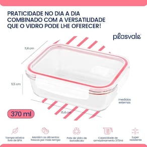 Praticidade no dia a dia combinado com a versatilidade que o vidro pode lhe oferecer Chegou o produto ideal para o preparo e armazenamento do seu alimento. Com a tampa, esses potes podem ser levados ao freezer e geladeira, tem vedação hermética que auxilia na conservação de qualquer alimento que necessite de refrigeração e as travas indicam ser o produto perfeito para aquela refeição fora de casa, pois traz segurança e que não vaza. O corpo, de vidro borossilicato, desde que sem a tampa, possibilita o preparo de alimentos no forno ou microondas, pois é resistente à altas temperaturas. Não perca a oportunidade e adquira o Pote de vidro hermético da Plasvale agora mesmo Dimensões: 15.4 x 11,4 x 5,5cm Comprimento x Largura x Altura Peso: 0,398 Kg Capacidade: 370 ml Corpo resistente à temperaturas entre -20 à 400ºC Recomendações de Uso: - Adequado para Microondas Sem a Tampa . - Permitido para Máquina de Lavar Sem a Tampa . - Apropriado para Forno Sem a Tampa . - Permitido para Freezer e Geladeira. Dicas Loja do Café : Lave antes do primeiro uso e não utilize produtos abrasivos. Lavar sempre com esponja macia e detergente neutro. Marca: Não Informado