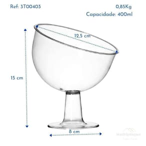Kit 06 Taça Inclinada Doceira Boca Torta com Pedestal 400ml Kit 06 Taça Inclinada Doceira Boca Torta com Pedestal Pequena 400mlQualidade, beleza e funcionalidade em suas festas e eventos CONTEUDO06 Taça Inclinada Doceira Boca Torta com Pedestal Pequena 400ml Taça inclinada ou Boca torta com pedestal, fabricada em poliestireno PS, moderna e resistente, utilizada e recomendada por profissionais de sucesso.Qualidade e sofisticação em suas festas e eventos, para servir sobremesas, salada de frutas, bolo gelado, gelatina, marshmallow, serviços de bomboniere, servir capsulas de café e muito mais. CARACTERÍSTICAS- Cor Branca Transparente- Material Poliestireno PS- Produto não toxico- Ideal para servir sobremesas, salada de frutas, bolo gelado, gelatina, marshmallow, serviços de bomboniere, servir capsulas de café e muito mais Marca: Três TriângulosRef: 3T00403Fotos meramente ilustrativas, outros objetos não acompanham o produto anunciado. DIMENSÕES INDIVIDUAIS APROXIMADASAltura: 15cmLargura Boca: 12,5cmLargura Base: 8cmPeso: 85g