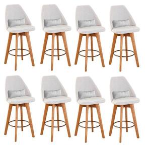 Kit 08 Banquetas Alta Maya Giratória Com Encosto Gourmet Linho Bege E Almofada Corino Branco - Aurora Line Banqueta Maya Giratória - Aurora Line A Banqueta Maya possui assento e pés em madeira eucalipto com sistema giratório! Os pés contam com um reforço que proporciona um suporte de peso de até 120 Kgs.O assento é revestido com espuma D-23. Além de bonita e charmosa, vai trazer para seu ambiente elegância e proporcionará conforto para sua família e amigos nos momentos de lazer.