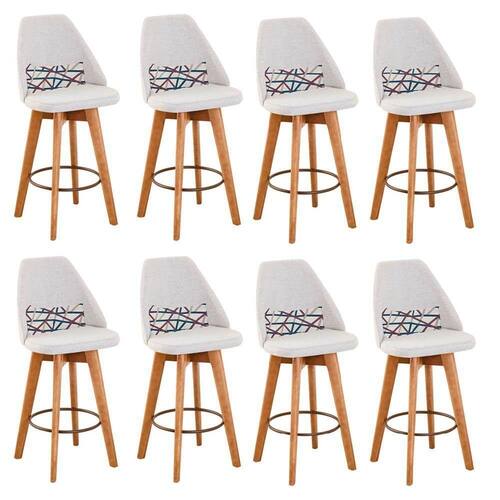 Kit 08 Banquetas Alta Maya Giratória Com Encosto Gourmet Linho Bege E Almofada Linhas Coloridas - Aurora Line Banqueta Maya Giratória - Aurora Line A Banqueta Maya possui assento e pés em madeira eucalipto com sistema giratório! Os pés contam com um reforço que proporciona um suporte de peso de até 120 Kgs.O assento é revestido com espuma D-23. Além de bonita e charmosa, vai trazer para seu ambiente elegância e proporcionará conforto para sua família e amigos nos momentos de lazer.