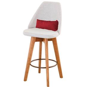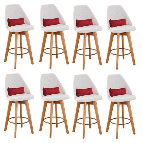 Kit 08 Banquetas Alta Maya Giratória Com Encosto Gourmet Linho Bege E Almofada Sintético Vermelho - Aurora Line Banqueta Maya Giratória - Aurora Line A Banqueta Maya possui assento e pés em madeira eucalipto com sistema giratório! Os pés contam com um reforço que proporciona um suporte de peso de até 120 Kgs.O assento é revestido com espuma D-23. Além de bonita e charmosa, vai trazer para seu ambiente elegância e proporcionará conforto para sua família e amigos nos momentos de lazer.