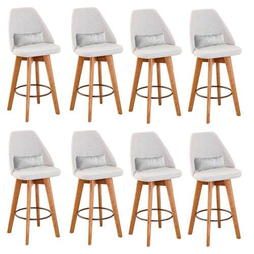 Kit 08 Banquetas Alta Maya Giratória Com Encosto Linho Bege Claro E Almofada Sintético Branco - Aurora Line Banqueta Maya Giratória - Aurora Line A Banqueta Maya possui assento e pés em madeira eucalipto com sistema giratório! Os pés contam com um reforço que proporciona um suporte de peso de até 120 Kgs.O assento é revestido com espuma D-23. Além de bonita e charmosa, vai trazer para seu ambiente elegância e proporcionará conforto para sua família e amigos nos momentos de lazer.