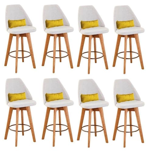 Kit 08 Banquetas Alta Maya Giratória Com Encosto Linho Bege Claro E Almofada Suede Amarelo - Gat Magazine