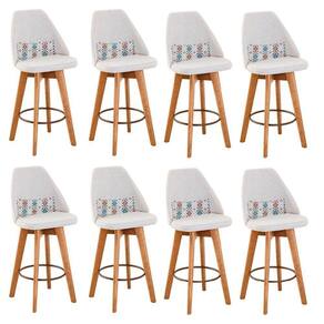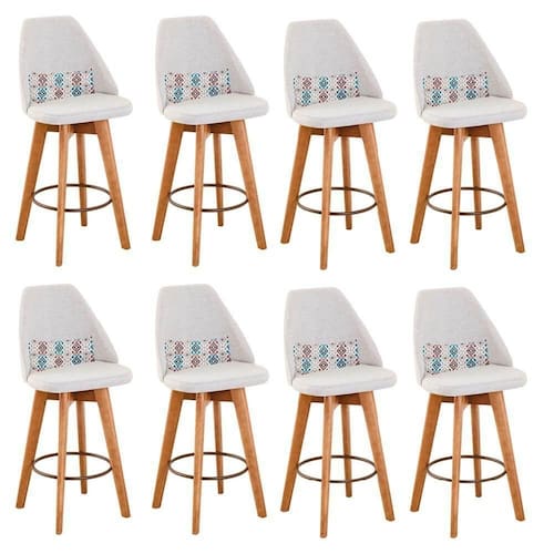 Kit 08 Banquetas Alta Maya Giratória Com Encosto Gourmet Linho Bege E Almofada Mosaico - Gat Magazine Banqueta Maya Giratória - GAT MAGAZINE A Banqueta Maya possui assento e pés em madeira eucalipto com sistema giratório! Os pés contam com um reforço que proporciona um suporte de peso de até 120 Kgs.O assento é revestido com espuma D-23. Além de bonita e charmosa, vai trazer para seu ambiente elegância e proporcionará conforto para sua família e amigos nos momentos de lazer.