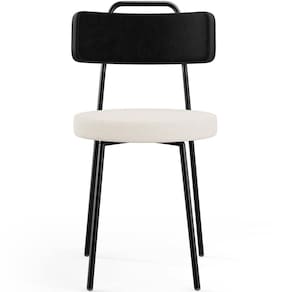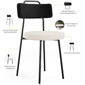 Revestimento do encosto em Couríssimo na cor Preto e do assento em Linho na cor Cru, com acabamento semi brilho.