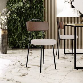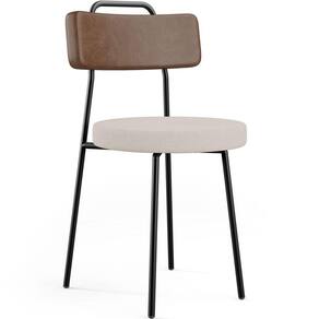 Revestimento do encosto em Couríssimo na cor Marrom e do assento em Linho na cor Bege, com acabamento semi brilho.