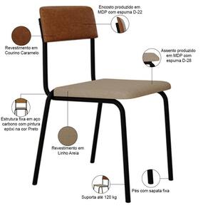 ProductContents: 08 Cadeiras | ProductWarranty: 90 dias após o recebimento do produto | Profundidade do assento: 40 cm | Firmeza: Firme | Largura da cadeira: 47,5 cm | Altura do assento a partir do solo: 47,5 cm | SupplierSimpleName: Kit 08 Cadeiras Estofada Para Sala de Jantar Sense Preto C01 Linho Areia Courino Caramelo - Lyam Dec | ColorFamily: Caramelo | Color: Caramelo | ColorSupplier: Caramelo | Cor da estrutura da cadeira: Preto | Material do estofamento: Aço, MDP, Linho e Couro sintético | Altura da cadeira: 81 cm | É empilhável: Não | ColorSimple: Caramelo | Fabricante: Lyam Decor | OriginState: PR | ProductLength: 51 cm | Requer montagem: Não | Tempo de montagem: na | Cor do estofamento: AreiaCaramelo | Material: Estrutura em Aço e MDP, Revestimento em Couro sintético | MaterialFamily: Aço, MDP, Linho e Couro sintético | Model: Sense | OriginCountry: Brasil | SizeDescription: Altura: 243 cm x Largura: 48 cm x Profundidade: 51 cm | ProductWidth: 48 cm | ProductHeight: 243 cm | ProductInstructions: Produto para uso em ambiente interno, nao devendo ficar exposto ao sol, calor e umidade excessivos. | ProductWeight: 43,2 Kg | Desenho do tecido: Liso | Cor do assento: Areia | É cadeira de balanço: Não | Profundidade da cadeira: 51 cm | Largura do assento: NA | Espessura do assento: na | Peso máximo suportado: 120 kg | É dobrável: Não | Cor: Caramelo
