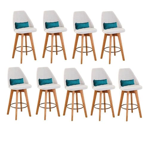 Kit 09 Banquetas Alta Maya Giratória Com Encosto Gourmet Linho Bege E Almofada Sintético Azul Turquesa - Aurora Line