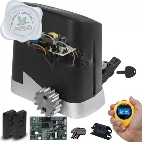 Placa Eletrônica de Comando: Bivolt (127V/220V); Fim de Curso Analógico; Receptor (RF) 433Mhz; Grava 50 controles; Embreagem eletrônica (força); Ajuste de Freio; Memorização automática de percurso A/F; Entradas para fotocélula (utilizar fonte externa) e botoeira; Saídas para Módulos Trava e Luz de Garagem; Rampa de fim de curso separadamente (abertura e fechamento); Ajuste de velocidade de fim de curso; Tempo de retardo para abertura com sinaleira; Compatível com PROG