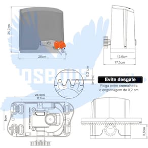ITENS INCLUSOS 01 Motor DZ Rio R700 Z18 1/2 HP PPA 01 Placa eletrônica de comando PPA (testada e codificada com os controles) 01 Conjunto de Sensor fim de curso (Instalado) 02 Ímãs com suporte para o sensor fim de curso 03 Metros de Cremalheira (50cm cada barra) 02 Controles remotos PPA 433Mhz (testada e codificada com a Placa de Comando) 01 Manual de operações