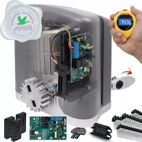 CARACTERÍSTICAS DO MOTOR • Potência de 0,25 ou 1/4 CV (portões até 400kg balanceado) • Motor: Monofásico 60Hz • Potência nominal (consumo): 127V - 370W / 220V - 515W • Consumo (A): 2,86A - 127V / 2,15A - 220V • Peso do portão: 400Kg • Redução: 1:23 • Abre portão de 4m em 14,1 seg. • Suporta até 23 aberturas por hora (ciclos/hora) • Rotação do motor 1740 RPM • Capacitor: 127V - 25µF / 220V - 12µF • Fim de curso Analógico (Reed Switch) • Engrenagem externa 18 dentes em alumínio • Coroa interna de Nylon com alma metálica • CENTRAL DE COMANDO PPA