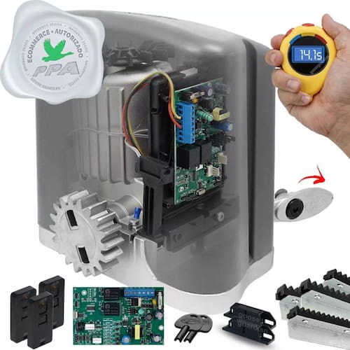 ITENS INCLUSOS 01 Motor PPA DZ Rio 400 KL Z18 1/4HP 01 Central de comando PPA (testada e codificada com os controles) 01 Capacitor 01 Conjunto de Sensor fim de curso (Instalado) 02 Ímãs com suporte para o sensor fim de curso 04 Metros de cremalheira (50cm cada barra) 03 Controles pretos c/ suporte (testados e codificados com a placa) 02 Chaves de destravamento 01 Manual de operações