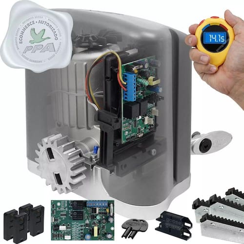 ITENS INCLUSOS 01 Motor PPA DZ Rio 400 KL Z18 1/4HP 01 Placa Eletrônica de comando PPA (testada e codificada com os controles) 01 Capacitor 01 Conjunto de Sensor fim de curso (Instalado) 02 Ímãs com suporte para o sensor fim de curso 04 Metros de cremalheira (50cm cada barra) 04 Controles pretos c/ suporte (testados e codificados com a placa) 02 Chaves de destravamento 01 Manual de operações
