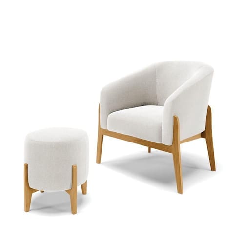 Kit 1 Poltrona E 1 Puff Stella Bouclê Base Madeira Castanho - D'rossi Cor Off White