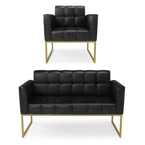 Você gosta de colecionar vários momentos memoráveis com sua família e amigos? Que tal recebê-los, com móveis de altíssima qualidade que só a DRossi tem? O Kit 01 Namoradeira e 01 Poltrona Elisa é adequado para você! Seu design retrô é a grande tendência do momento. Pode ser em diversos espaços da casa, em salas, hall de entrada, quartos, cozinhas, varanda, ada, escritório, dentre outros. Contém as seguintes características: A estrutura é feita de madeira de Eucalipto 100% de reflorestamento, e a Base Metálica Industrial Dourado, além de ser resistente e durável, suporta em média até 120 kg. Assento, encosto e braços, contém enchimento de espuma D-23 e é estofado em tecido Corano, no tom Preto, que oferece muito conforto e resistência ao sentar, com aquela sensação de maciez e aconchego. Possui também, detalhes de costura no encosto e assento, resultando em um acabamento impecável, conferindo muito mais valor e elegância ao seu espaço. Para complementar a decoração com esse lindo kit, a dica é utilizar mantas, almofadas ou vasinho de flor. E pronto, seu cantinho estará perfeito para descansar e relaxar! Aqui, você encontra várias opções, para que seus amigos e familiares se sintam acolhidos. Garanta já seu kit.