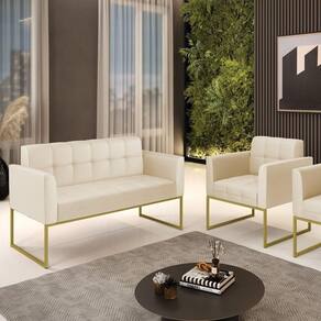 Você gosta de colecionar vários momentos memoráveis com sua família e amigos? Que tal recebê-los, com móveis de altíssima qualidade que só a DRossi tem? O Kit 01 Namoradeira e 01 Poltrona Elisa é adequado para você! Seu design retrô é a grande tendência do momento. Pode ser em diversos espaços da casa, em salas, hall de entrada, quartos, cozinhas, varanda, ada, escritório, dentre outros. Contém as seguintes características: A estrutura é feita de madeira de Eucalipto 100% de reflorestamento, e a Base Metálica Industrial Dourado, além de ser resistente e durável, suporta em média até 120 kg. Assento, encosto e braços, contém enchimento de espuma D-23 e é estofado em tecido Corino, que oferece muito conforto e resistência ao sentar, com aquela sensação de maciez e aconchego. Possui também, detalhes de costura no encosto e assento, resultando em um acabamento impecável, conferindo muito mais valor e elegância ao seu espaço. Para complementar a decoração com esse lindo kit, a dica é utilizar mantas, almofadas ou vasinho de flor. E pronto, seu cantinho estará perfeito para descansar e relaxar! Aqui, você encontra várias opções, para que seus amigos e familiares se sintam acolhidos. Garanta já seu kit.