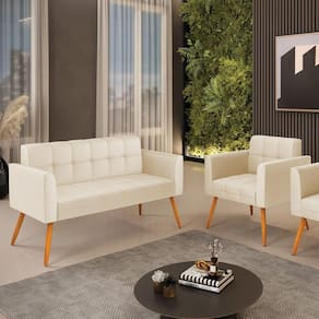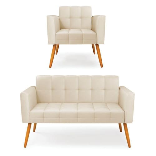 Você gosta de colecionar vários momentos memoráveis com sua família e amigos? Que tal recebê-los, com móveis de altíssima qualidade que só a DRossi tem? O Kit 01 Namoradeira e 01 Poltrona Elisa é adequado para você! Seu design retrô é a grande tendência do momento. Pode ser utilizado em diversos espaços da casa, em salas, hall de entrada, quartos, cozinhas, varanda, sacada, escritório, dentre outros. Contém as seguintes características: A estrutura é feita de madeira de Eucalipto 100% de reflorestamento, e os Pés Palito Castanho, além de serem resistentes e duráveis, suportam em média até 120 kg. Assento, encosto e braços, contém enchimento de espuma D-23 e é estofado em tecido Corino, no tom Bege, que oferece muito conforto e resistência ao sentar, com aquela sensação de maciez e aconchego. Possui também, detalhes de costura no encosto e assento, resultando em um acabamento impecável, conferindo muito mais valor e elegância ao seu espaço. Para complementar a decoração com esse lindo kit, a dica é utilizar mantas, almofadas ou vasinho de flor. E pronto, seu cantinho estará perfeito para descansar e relaxar! Aqui, você encontra várias opções, para que seus amigos e familiares se sintam acolhidos. Garanta já seu kit.