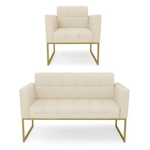 Você gosta de colecionar vários momentos memoráveis com sua família e amigos? Que tal recebê-los, com móveis de altíssima qualidade que só a DRossi tem? O Kit 01 Namoradeira e 01 Poltrona Elisa é adequado para você! Seu design retrô é a grande tendência do momento. Pode ser em diversos espaços da casa, em salas, hall de entrada, quartos, cozinhas, varanda, ada, escritório, dentre outros. Contém as seguintes características: A estrutura é feita de madeira de Eucalipto 100% de reflorestamento, e a Base Industrial Metálica Dourada, além de ser resistente e durável, suporta em média até 120 kg. Assento, encosto e braços, contém enchimento de espuma D-23 e é estofado em tecido Linho, no tom Bege, que oferece muito conforto e resistência ao sentar, com aquela sensação de maciez e aconchego. Possui também, detalhes de costura no encosto e assento, resultando em um acabamento impecável, conferindo muito mais valor e elegância ao seu espaço. Para complementar a decoração com esse lindo kit, a dica é utilizar mantas, almofadas ou vasinho de flor. E pronto, seu cantinho estará perfeito para descansar e relaxar! Aqui, você encontra várias opções, para que seus amigos e familiares se sintam acolhidos. Garanta já seu kit.