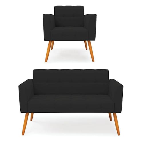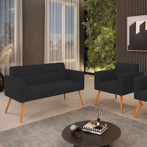 Kit 1 Sofá Namoradeira E 1 Poltrona Elisa Veludo Preto Pés Palito Castanho - D'rossi