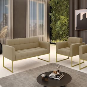 Você gosta de colecionar vários momentos memoráveis com sua família e amigos? Que tal recebê-los, com móveis de altíssima qualidade que só a DRossi tem? O Kit 01 Namoradeira e 01 Poltrona Elisa é adequado para você! Seu design retrô é a grande tendência do momento. Pode ser utilizado em diversos espaços da casa, em salas, hall de entrada, quartos, cozinhas, varanda, sacada, escritório, dentre outros. Contém as seguintes características: A estrutura é feita de madeira de Eucalipto 100% de reflorestamento, e a Base Industrial Metálica Dourada, além de ser resistente e durável, suporta em média até 120 kg. Assento, encosto e braços, contém enchimento de espuma D-23 e é estofado em tecido Suede, que oferece muito conforto e resistência ao sentar, com aquela sensação de maciez e aconchego. Possui também, detalhes de costura no encosto e assento, resultando em um acabamento impecável, conferindo muito mais valor e elegância ao seu espaço. Para complementar a decoração com esse lindo kit, a dica é utilizar mantas, almofadas ou vasinho de flor. E pronto, seu cantinho estará perfeito para descansar e relaxar! Aqui, você encontra várias opções, para que seus amigos e familiares se sintam acolhidos. Garanta já seu kit.