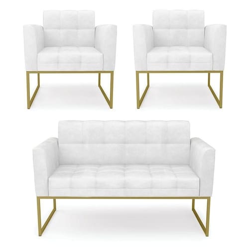 Você gosta de colecionar vários momentos memoráveis com sua família e amigos? Que tal recebê-los, com móveis de altíssima qualidade que só a DRossi tem? O Kit 01 Namoradeira e 02 Poltronas Elisa é adequado para você! Seu design retrô é a grande tendência do momento. Pode ser em diversos espaços da casa, em salas, hall de entrada, quartos, cozinhas, varanda, sacada, escritório, dentre outros. Contém as seguintes características: A estrutura é feita de madeira de Eucalipto 100% de reflorestamento, e a Base Metálica Industrial Dourado, além de ser resistente e durável, suporta em média até 120 kg. Assento, encosto e braços, contém enchimento de espuma D-23 e é estofado em tecido Corano, que oferece muito conforto e resistência ao sentar, com aquela sensação de maciez e aconchego. Possui também, detalhes de costura no encosto e assento, resultando em um acabamento impecável, conferindo muito mais valor e elegância ao seu espaço. Para complementar a decoração com esse lindo kit, a dica é utilizar mantas, almofadas ou vasinho de flor. E pronto, seu cantinho estará perfeito para descansar e relaxar! Aqui, você encontra várias opções, para que seus amigos e familiares se sintam acolhidos. Garanta já seu kit.