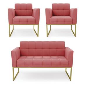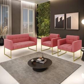 Você gosta de colecionar vários momentos memoráveis com sua família e amigos? Que tal recebê-los, com móveis de altíssima qualidade que só a DRossi tem? O Kit 01 Namoradeira e 02 Poltronas Elisa é adequado para você! Seu design retrô é a grande tendência do momento. Pode ser em diversos espaços da casa, em salas, hall de entrada, quartos, cozinhas, varanda, sacada, escritório, dentre outros. Contém as seguintes características: A estrutura é feita de madeira de Eucalipto 100% de reflorestamento, e a Base Industrial Metálica Dourada, além de ser resistente e durável, suporta em média até 120 kg. Assento, encosto e braços, contém enchimento de espuma D-23 e é estofado em tecido Suede, que oferece muito conforto e resistência ao sentar, com aquela sensação de maciez e aconchego. Possui também, detalhes de costura no encosto e assento, resultando em um acabamento impecável, conferindo muito mais valor e elegância ao seu espaço. Para complementar a decoração com esse lindo kit, a dica é utilizar mantas, almofadas ou vasinho de flor. E pronto, seu cantinho estará perfeito para descansar e relaxar! Aqui, você encontra várias opções, para que seus amigos e familiares se sintam acolhidos. Garanta já seu kit.