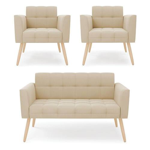 Kit 1 Sofá Namoradeira E 2 Poltronas Elisa Suede Pés Palito Natural - D`rossi Cor Bege - Blush