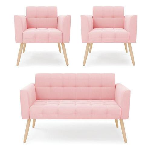 Kit 1 Sofá Namoradeira E 2 Poltronas Elisa Suede Pés Palito - D'rossi Cor Rosa Bebê
