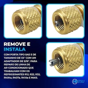 Fácil Substituição de Núcleo Schrader: Desenvolvida para substituir rapidamente o núcleo Schrader sem a necessidade de liberar o gás refrigerante do sistema.