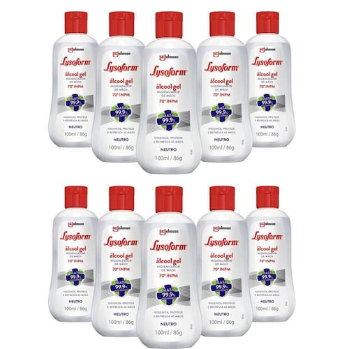 O Kit contém: 10 Álcool em Gel Lysoform Higienizador para as Mãos Neutro com 100ml cada.
