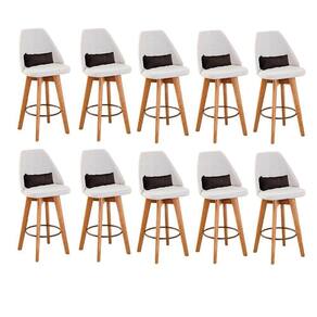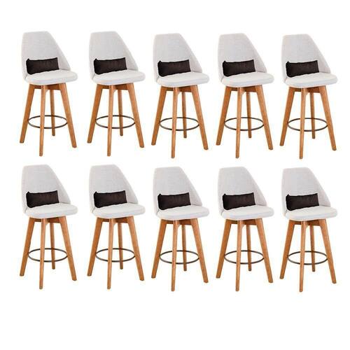 Kit 10 Banquetas Alta Maya Giratória Com Encosto Linho Bege Claro E Almofada Corino Marrom - Gat Magazine Banqueta Maya Giratória - GAT MAGAZINE A Banqueta Maya possui assento e pés em madeira eucalipto com sistema giratório! Os pés contam com um reforço que proporciona um suporte de peso de até 120 Kgs.O assento é revestido com espuma D-23. Além de bonita e charmosa, vai trazer para seu ambiente elegância e proporcionará conforto para sua família e amigos nos momentos de lazer.