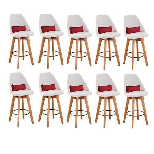 Kit 10 Banquetas Alta Maya Giratória Com Encosto Linho Bege Claro E Almofada Suede Vermelho - Gat Magazine Banqueta Maya Giratória - GAT MAGAZINE A Banqueta Maya possui assento e pés em madeira eucalipto com sistema giratório! Os pés contam com um reforço que proporciona um suporte de peso de até 120 Kgs.O assento é revestido com espuma D-23. Além de bonita e charmosa, vai trazer para seu ambiente elegância e proporcionará conforto para sua família e amigos nos momentos de lazer.