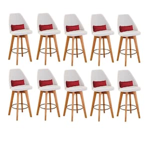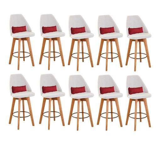 Kit 10 Banquetas Alta Maya Giratória Com Encosto Gourmet Linho Bege E Almofada Corino Vermelho - Gat Magazine Banqueta Maya Giratória - GAT MAGAZINE A Banqueta Maya possui assento e pés em madeira eucalipto com sistema giratório! Os pés contam com um reforço que proporciona um suporte de peso de até 120 Kgs.O assento é revestido com espuma D-23. Além de bonita e charmosa, vai trazer para seu ambiente elegância e proporcionará conforto para sua família e amigos nos momentos de lazer.